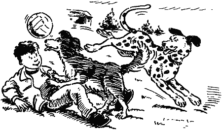Дотти, будучи крупнее и выше своего приятеля, в три прыжка догнала мяч и остановила его лапой. Сэм мчался следом. Не желая отдавать свою добычу сопернику, Дотти, недолго думая, схватила мяч зубами и понеслась в обратном направлении. Найдя взглядом Нила, она подлетела к нему и положила мяч к его ногам. Затем она присела и, повиливая хвостом, склонила голову набок, словно говоря: «Как насчет печеньица?»