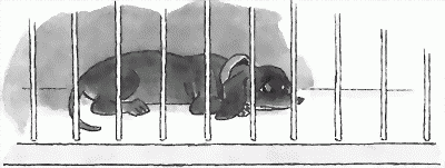 Служитель в фуражке бросил быстрый взгляд на Грустика: «Такса. Должно быть, из богатого дома». Грустик попытался просунуть нос сквозь прутья решетки, но промежутки между прутьями были слишком узки. Тогда он заметался из конца в конец тесной клетки. Его охватил страх, леденящий и томительный.