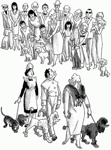 Какое оживление! Сколько народу! Самые причудливые собаки на поводке или на руках у хозяев. Глядите! Возле клумбы с розами пойнтер какой-то дамы наскакивает на пинчера элегантного господина. Господин берет пинчера на руки и с гордым видом удаляется.