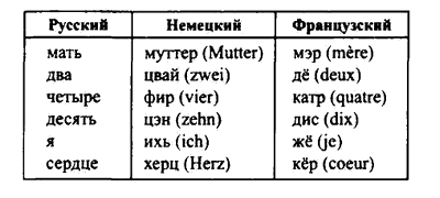 Даже в языках-братьях часто невозможно установить ни одного сходного звука, например, дваи япо-немецки цвай(zwei) и ихь(ich), по-английски ту(two) и аи(I); дочь по-французски фнй(fille), по-испански иха(hija). Но когда ученые сравнили древние формы языков, то картина поистине получилась поразительная (см. стр. 218–219).