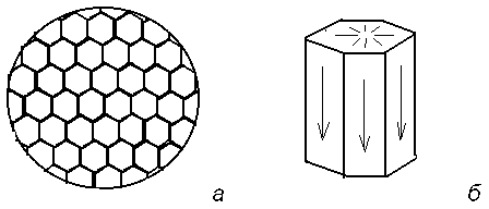 Рис.5. Ячейки Бенара: а — вид сверху, б — отдельная ячейка.