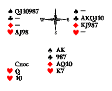 Выиграть трефовую игру практически невозможно. Положите эти карты себе, а оставшиеся — несколько раз распределите между двумя руками случайным образом. Вы увидите сами, что при трефовом козыре редко когда получится пять взяток. При пиковом козыре тоже не сахар, но при некоторых раскладах можно «выпилить». А уж пять взяток будут практически всегда. В реальной жизни расклад выдался таким: