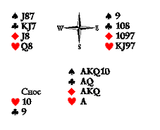 Юг купил и должен заказать контракт. Ход собственный. Какую масть назначить козырем? Для виста в светлую козырная масть вроде бы не имеет значения. В бубновом контракте, если начнут втёмную сокращать козырей, придётся угадывать трефовую позицию.