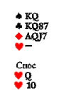 Особое место в проблеме заказа козыря занимает «струна», т. е. расклад, когда разыгрывающий имеет в каждой масти по три карты. Нет проблем, если это: