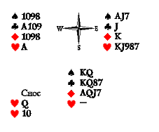 Обратите внимание на один тонкий момент: разыгрывающий не должен отбирать козырей. Если козырнуть три раза, а потом пойти с треф, то единственная черва Запада выбьет последнего козыря, а туз пик обеспечит переход к четырём берущим червам Востока. Можно, конечно, откозыряв, пойти с пик самому, атакуя коммуникации противников и обеспечивая свою игру, но немедленный розыгрыш треф до отбора козырей позволяет взять семь взяток, так как «опасные» ходы Востока в черву сокращают козырей не только Юга, но и Запада, являясь «бесполезными сюркупами».