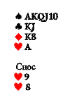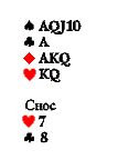 И это ещё очень хорошая карта. На ней можно даже играть без козыря. Но лучше заказать козырем такую масть, которую вы никогда сами не разработаете так, чтобы получить две-три взятки. В данном случае лучший козырь — бубна (или трефа). Снести можно две червы.