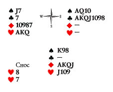 Атака дамой червей. Сколько взяток берёт разыгрывающий? Кроме четырёх верных взяток на тузов и королей, у Юга играет дама пик (король второй) и валет треф (нужно пойти в трефу с короля, обваливая даму). Есть шанс на седьмую взятку, но только в том случае, если вистующие ошибутся и позволят разыгрывающему впустить (см. главу «Впустка» ) Запада.
