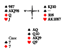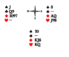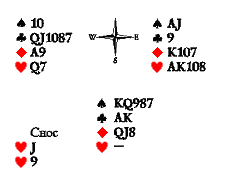 Может быть, следует начать с треф, а на короля пик сбросить с руки Востока даму, чтобы сохранить козырной приём в руке Запада. В этом случае Юг окажется перед неразрешимой задачей: