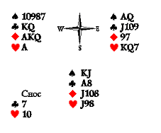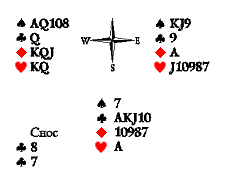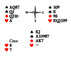 Убив черву козырем, Юг сыграет козырь-козырь, после чего впустит Запада третьей бубной и получит седьмую взятку на короля пик.