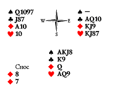 Ход Востока последней трефой вызывает у Юга вопль отчаяния: он вынужден снести последнюю черву и, получив свою пику, наиграть бубну. Восемь взяток.