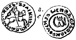 На одной стороне первых денег Московского княжества написано по-русски имя Дмитрия Донского, но на другой стороне находится татарская надпись, занявшая довольно прочное место на ранних монетах многих выпусков как в Москве с ее уделами, так и в княжествах, расположенных восточнее… Татарские надписи, зачастую бессмысленные или даже нечитаемые, на ранних русских двуязычных монетах в прошлом рассматривались как результат даннических отношений. [17], с.96.