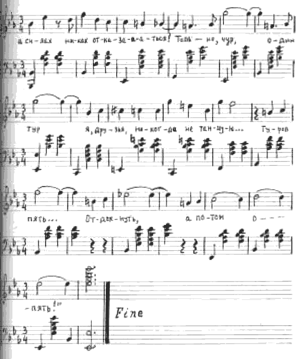 Мечтала я,мои друзья,взять мужем стройного юнца!Но, как назло,не повезло – я вышла замуж за вдовца…Совсем старик – очки, парик,«танцует вальс» три раза в год!…Три раза в год!И то – так скверно,что я скажу вам, без забот:Кто из вас,здесь сейчасмне предложит тур вальса промча-а-аться,то, клянусь,соглашусь,я не в силах никак отказа-а-аться! Только, чур,один туря, друзья, никогда не танцую…Туров пять…Отдохнуть,а потом опять!Х………………Бриллиантов блески шум, и треск,занятья светской болтовней,законы мод – я ненавижуи только вальс люблю душой:«Кто ж сейчасздесь из васмне предложит тур вальса промча-а-аться,я, клянусь,соглашусь – я не в силах никак отказа-а-аться…Только, чур,один туря, друзья, никогда не танцую…Туров пять…Отдохнуть,а потом опять!Любила Анна Сергеевна не торопясь разложить несколько пасьянсов, чем вчера и занялась после ужина, а я показал незнакомый ей пасьянс под пикантным названием «Аборт» – как говорили мне, якобы любимый Леонидом Витальевичем Собиновым. Пасьянс требовал внимания, создания некоторой умозрительной комбинации при его раскладке и выходил довольно редко. Когда я показывал пасьянс, он сошелся, после чего тетя Нюша под моим руководством тоже стала его раскладывать – он не вышел… Она во второй раз разложила пасьянс – опять неудача. Тогда, дабы тетя Нюша лучше уяснила новый пасьянс, я еще раз его разложил, а она внимательно смотрела и задавала вопросы – пасьянс вышел. Ободренная результатом, тетя Нюша взяла у меня карты и стала сама раскладывать злополучный пасьянс, я же пожелал ей спокойной ночи и пошел спать; когда, закрывая дверь в комнату, где меня поселили, я обернулся, мне запомнилась фигура маленькой старушки в халате, чуть склоненная над столом, на котором тетя Нюша продолжала раскладывать «упрямый» пасьянс.