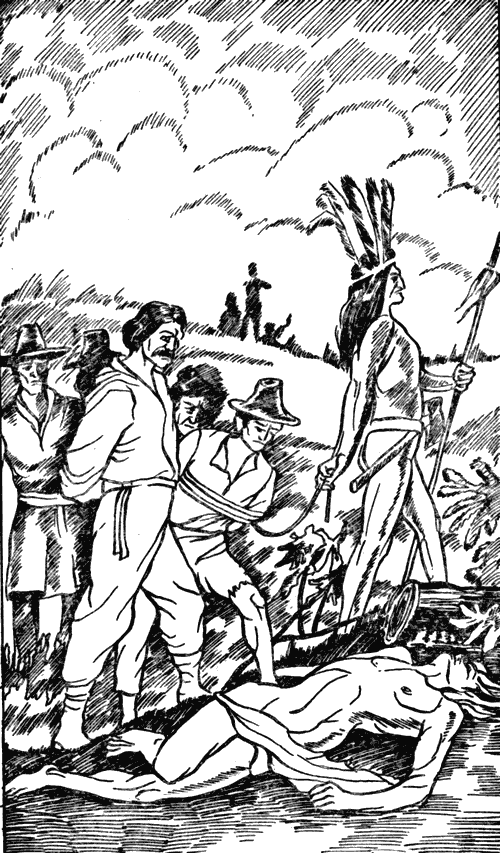 Это был труп рослого, красивого индейца. В груди его была широкая поперечная рана: чья-то злобная рука вырвала сердце из груди убитого и бросила его к его ногам. Когда длинная вереница пленных приблизилась к этому месту, большая жирная крыса юркнула в кусты.