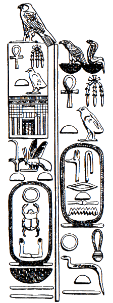 «Великое имя» фараона Гарамгеба (1340–1314 до н. э.), например, состоит из пяти частей. Перечень открывает Гор, намекая на воплощение бога-сокола Гора, и еще более усиливая его определением «золотой». Второе имя величает его как «любимца обеих повелительниц», таким образом фараон связан с богинями Нижнего и Верхнего Египта. Потом он, понятно, провозглашается «царем Верхнего и Нижнего Египта». «Сын Рэ (Ра)», это имя он получает как династическое. Иногда давались четыре «великих имени», как, например, фараону Сесострису I (1971–1930 до н. э.): на его изображении слева вверху имя Гора, под ним «Царь Верхнего и Нижнего Египта» сопровождается словами «Власть бога Рэ осуществляется», справа вверху «имена двух повелительниц», под ними имя, получаемое при рождении.