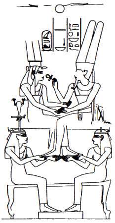 В качестве примера может послужить история рождения фараона Аменофиса III (1417–1377 до н. э.), которая с блеском обрисована в обширном цикле изображений в храме Амона в Луксоре. Появляется богиня любви Хатор, которая сообщает царице, что бог Амон желает соития с ней. Амон сообщает свое желание царю. Затем оба садятся друг против друга, две богини держат их ноги. Бог Амон протягивает царице знак жизни, временный символ божественного брака. Зачатие нового фараона — это божественно-человеческое событие, в котором кроме Амона помогают также еще множество богов. Бог гончарного искусства Хнум «строит» тело царского дитяти на своем гончарном круге, а Хатор вдувает в него жизнь.