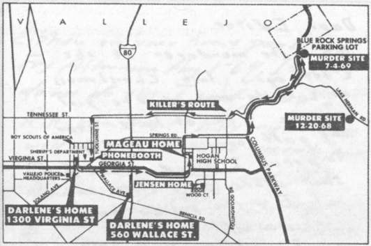 Маршрут Зодиака ночью 4 июля 1969 года (преследование Дарлены Феррин и Майкла Мажо и нападение на них). Отмечено также место убийства Бетти Лу Дженсен и Дэвида Фарадея. Карта составлена автором