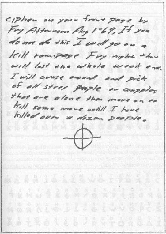 Содержащий угрозы фрагмент письма Зодиака в «Вальехо таймс геральд», 1 августа 1969 года