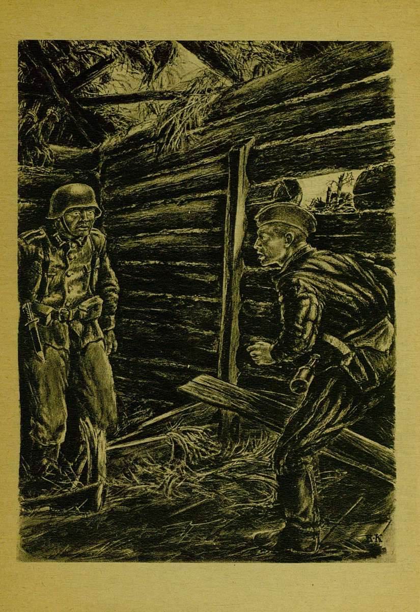 В это мгновение в углу поднялся другой немец и испуганно уставился на Кушева. Разведчик кинулся к нему, но широкоплечий атлет-немец отшвырнул его, как перышко. Больно стукнувшись о косяк, Кушев быстро вскочил на ноги и в следующую секунду уже висел на немце. Они барахтались на соломе, стараясь ухватить друг друга за горло. В пылу борьбы Кушев ловко выхватил у немца тесак и ударил врага в грудь. Немец, охнув, повалился к стенке. Кушев выскочил наружу. Капуста с помощью подоспевшего Пекшева все еще продолжал борьбу с часовым. Они скрутили его и повели.