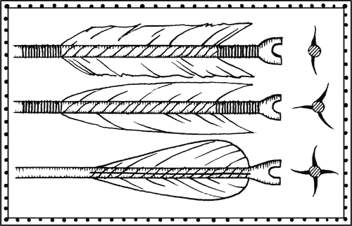 Ушко стрелы, куда вкладывалась тетива, также имело вполне определённые размеры и форму. Слишком глубокое тормозило бы полёт стрелы, при слишком мелком стрела сидела на тетиве недостаточно прочно. Богатый опыт наших предков позволил вывести оптимальные размеры: глубина – 5–8 мм, редко 12, ширина – 4–6 мм. Таковы ушки стрел Х века, такими были они и через пятьсот лет.