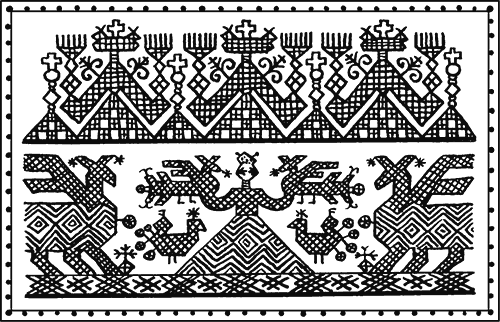 А вот какая композиция бытовала в русской народной вышивке, сохранившей, как известно, древнейшие языческие мотивы. Центральное место в ней занимает фигура женщины, держащей в поднятых руках два деревца или двух птиц. Нередко фигура женщины переходит в силуэт дерева – Мирового Древа славян, символа Вселенной. Столь же часто очертания женщины-дерева перерастают в контур жилища…