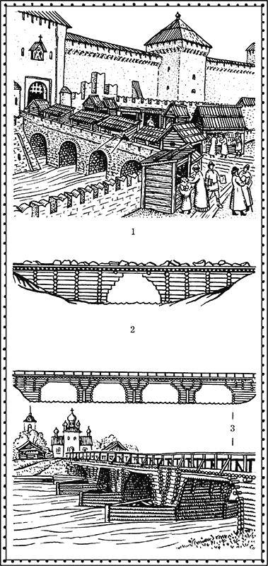 Более солидные водные препятствия требовали, понятно, и более основательных сооружений. Постоянные мосты, такие как Великий мост через Волхов в Новгороде, опирались на самые настоящие быки – городни. Судя по некоторым сохранившимся остаткам, городни древнерусских мостов представляли собой деревянные срубы треугольной формы, которые опускали в реку, располагая одной из вершин против течения, и укрепляли дополнительными брёвнами, наклонно врытыми в дно. Изнутри сруб набивали камнями, а сверху устанавливали особо длинные брёвна, чтобы уменьшить нагрузку на пролёт. Великий мост в Новгороде, сооружённый не позже начала ХII века (в 1153 году его уже чинят), насчитывал почти тридцать городен. Титаническая работа!