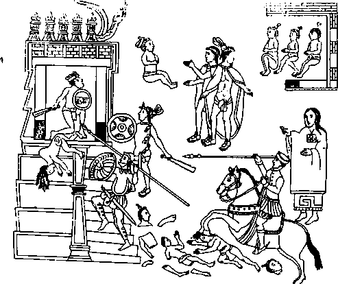 При рассмотрении этих хроник следует обратить внимание на два момента: ненависть Тласкалы, подчеркиваемая, естественно, сторонниками ацтеков, и избиение носильщиков воды и провизии иод тем предлогом, что они прекратили поставку продовольствия. Описание-резни де Саагу- ном и Товаром нельзя считать надежным. Авторы вдохновлены здесь известным в то время сюжетом о Тоскатле. В ироацтекских источниках обходится полным молчанием причастность Монтесумы к данному событию, что вполне понятно. Проводится та мысль, что мешики сражались с испанцами, только когда последние вынуждали их к этому. В связи с этим Монтесума превращается авторами в труса, что было, как известно, одним из главных пунктов проац- текских текстов. Трус, понятно, не устраивает засад...