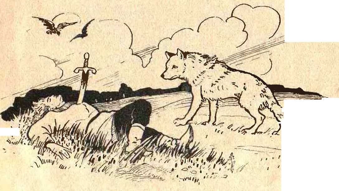 И только тот спустился, разом цап Его за хвост; закаркал старый ворон. «Пусти меня на волю, Серый Волк»,— Кричал он. « Не пущу, — тот отвечал, — Пока не принесёт твой воронёнок Живой и мёртвой мне воды!» И ворон Велел лететь скорее воронёнку За мёртвою и за живой водою.