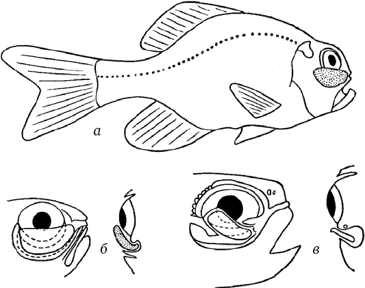 Рыбы со светоносными органами, связанными с глазами: а – Photoblepharon palpebratus; б – его голова в профиле и в разрезе, показывающих светопроизводящий орган и экран, его закрывающий; в – голова Anomalops katoptron, профиль и разрез. Видно светоносное приспособление и углубление, в которое оно может прятаться