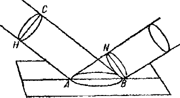 Рассматривая предшествующее доказательство, можно было бы сказать, что хотя BN действительно является общей касательной всех круговых волн в плоскости этого рисунка, но что эти волны, будучи на самом деле сферическими, имеют, кроме того, еще бесконечное число подобных касательных, которыми будут все прямые, проведенные из точки В по поверхности конуса, образуемого прямою BN при вращении вокруг оси BA. Остается, следовательно, показать, что в этом обстоятельстве не имеется никакой трудности; заодно выяснится, почему падающий и отраженный лучи находятся всегда в одной и той же плоскости, перпендикулярной к отражающей плоскости. И вот я говорю, что волна AC, рассматриваемая только как линия, не производит света. Дело в том, что видимый световой луч, как бы он ни был узок, всегда имеет некоторую толщину; поэтому, чтобы представить волну, продвижение которой производит этот луч, нужно вместо линии AC взять плоскую фигуру, подобно кругу HC на данном рисунке (рис. 57), предполагая, как было сделано раньше, что светящаяся точка бесконечно удалена. Но из предшествующего доказательства легко видеть, что каждая маленькая точка этой волны HC, достигнув плоскости АВ, породит там свою отдельную волну, и все эти волны, когда точка С достигнет точки В, будут иметь общую касательную плоскость, а именно круг BN, равный СН; этот круг будет пересечен посредине под прямыми углами той же самой плоскостью, которая таким же образом пересекает круг СН и эллипс АВ. Также видно, что указанные сферы отдельных волн не могут иметь другой общей касательной плоскости, кроме круга BN; в этой плоскости отраженного движения будет гораздо больше, чем где-либо в другом месте, и поэтому она будет нести в себе свет, являющийся продолжением волны СН.