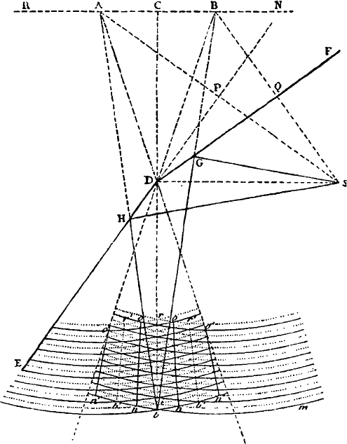 Только что нами сказанное станет более понятным с помощью рисунка; он представляет сечение двух зеркал и отраженных волн, сделанное плоскостью, проведенной через светящуюся точку перпендикулярно к зеркалам, которые проектируются по ED и DF.