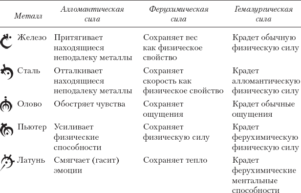 Алломантические металлы — существует восемь базовых алломантических металлов. Они идут парами, которые состоят из главного металла и его сплава. Базовые металлы также можно подразделить на две группы по четыре: внутренние металлы (олово, пьютер, медь, бронза) и внешние металлы (железо, сталь, цинк, латунь). Долгое время считалось, что алломантических металлов всего десять: восемь базовых, а также золото и атиум. Однако открытие активных сплавов золота и атиума увеличило число металлов до двенадцати. Открытие алюминия и дюралюминия довело этот показатель до четырнадцати.