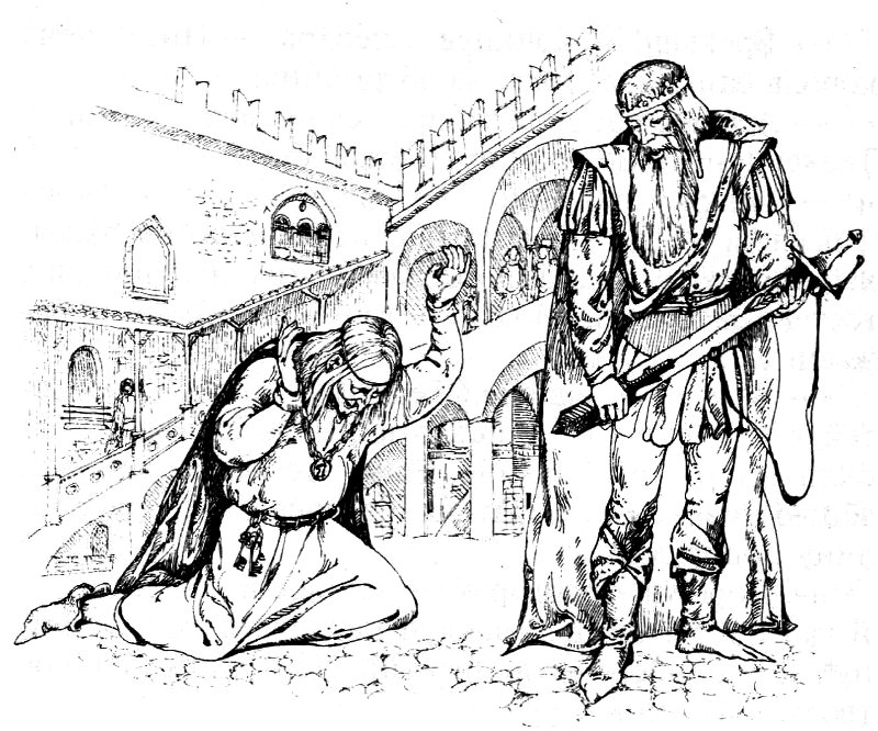 — Можна було чекати такого вчинку від нащадка Еорла, навіть обтяженого роками, — стиха почав він. — Але друзі, які по-справжньому його люблять, мали б пощадити його сивину. Горе нам! Новим улюбленцям байдужа доля мого правителя! Нічого не поробиш… Прошу лише послухати моє останнє прохання: залиши в місті людину, яка шанує твою волю! Дозволь вірному Гриму стежити за порядком до твого повернення — хоча здоровий глузд підказує, що надій на нову зустріч мало…