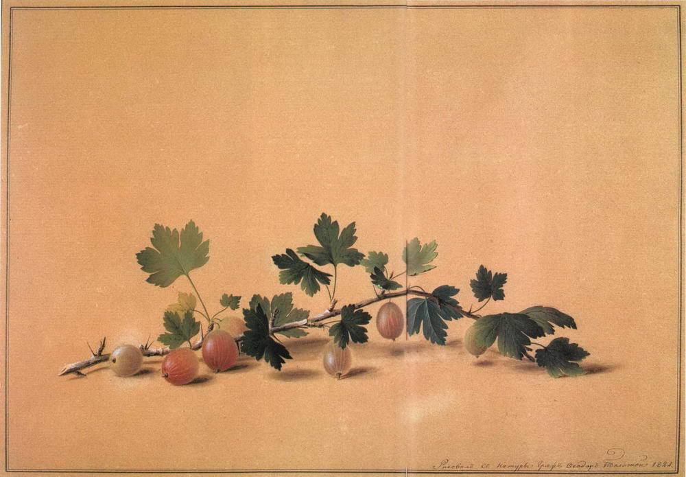 Один из шедевров творчества Толстого Ветка крыжовника (1821) - крепкая веточка редкой красоты розовато-бордовых переливов и колючей бархатистости ягод крыжовника на фоне легкого узора его листьев.
