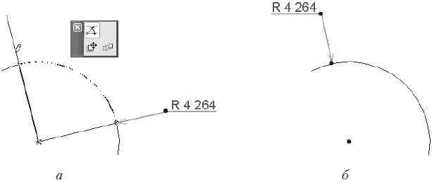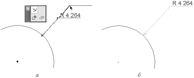 Щелчок на этой кнопке вызывает операцию углового перемещения радиального размера. Двигая указатель мыши, необходимо определить угол перемещения (рис. 10.14, а), а затем нужно щелкнуть кнопкой мыши для его фиксации. Радиальный размер переместится в новое место (рис. 10.14, б).