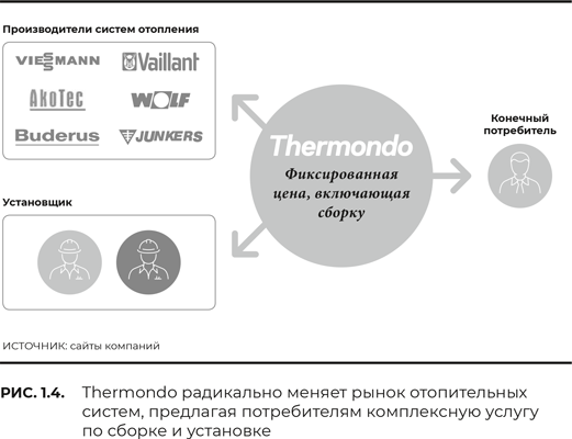 Однако берлинский стартап Thermondo разрушил эту модель, создав платформу, объединяющую разрозненные монтажно-сервисные бригады, поставляющие отопительные системы клиентам по всей Германии. Портал появился в 2012 г. А уже в 2015 г. среднегодовые темпы роста компании составили 864 %. Клиент, просматривающий портал, может выбрать систему отопления из множества брендов, причем по индивидуальной фиксированной цене, которая включает в себя установку. Thermondo даже дает рекомендации по поиску финансирования (рис. 1.4). Подобную модель сейчас можно наблюдать на рынке онлайн-сервисов дизайна интерьеров, которые позволяют заказывать домашнюю мебель и технику.