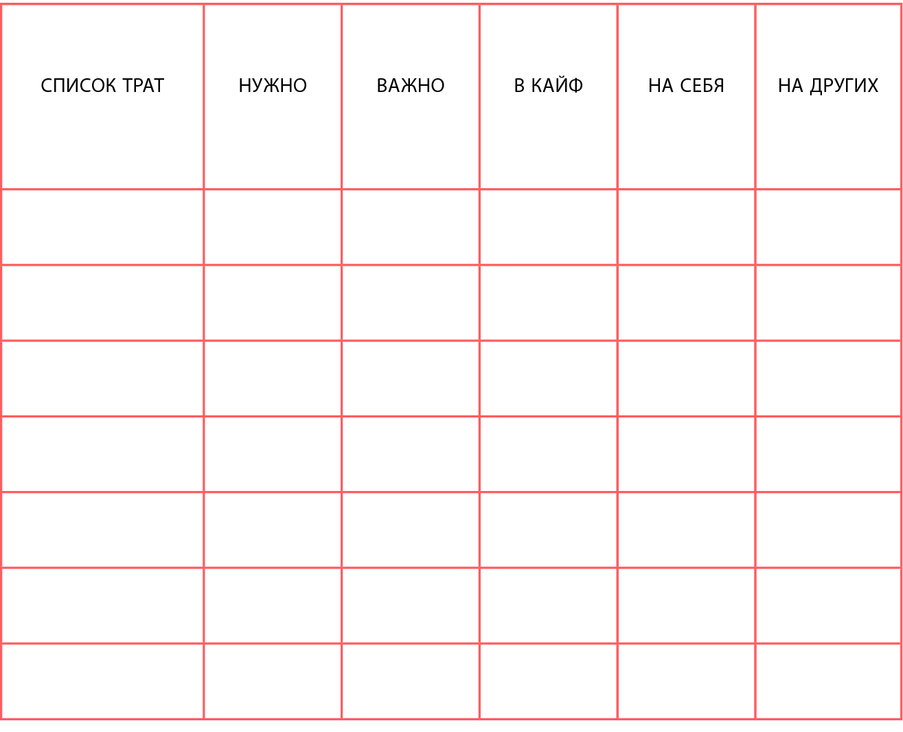 Идеально, если ты заполнишь ее тратами за прошлый месяц. Если же сделаешь траты за 2 месяца, то результат получится намного точнее и интереснее. При этом до копейки считать не нужно, пиши примерно, этого будет достаточно для дальнейшего подсчета в процентном соотношении.