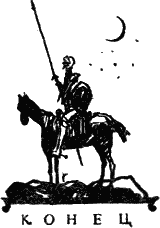 И он увидел удаляющегося туда гигантского и костлявого всадника: через пространства и времена гнался за уходящим мерцанием рыцарь-копыта его клячи спотыкались на испанской земле, но благородная и смешная его голова почти касалась звезд.