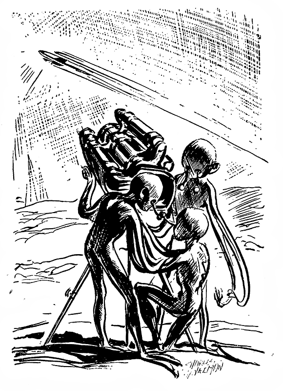 Внизу, на залитой ярким светом пустынной планете Артна, трое обнаженных марсиан, не отрываясь, глядели на экран телеприемника, на котором перед их взором разворачивались события, происходящие в кабине серебристого космического корабля землян. Их строгие математические умы старались постичь логику поведения людей. Вскоре экран телеприемника погас, так как корабль чуть изменил курс и вышел из поля зрения следящего устройства. Один из марсиан склонился над прибором, и над планетой зазвучали высокие, невыразительные голоса.