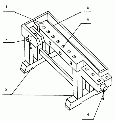 Рис. 6. Верстак: 1 – рабочая доска; 2 – опоры-основания; 3 – поперечный зажим; 4 – продольный зажим; 5 – гнезда, 6 – лоток