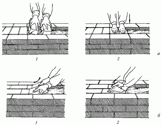 Кирпич держите почти плашмя на расстоянии 6–8 см от ранее уложенного, постепенно опуская кирпич на растворную постель, загребите ребром незначительное количество раствора, придвиньте кирпич вплотную к ранее уложенному и нажимом рук осадите его на место. Вертикальные швы остаются при этом частично пустыми. Их заполните при расстилании раствора для кладки следующего по высоте ряда, при этом следите за тем, чтобы поперечные швы между кирпичами заполнялись полностью. Плохое заполнение вертикальных поперечных швов раствором не только снижает прочность кладки, но и увеличивает продуваемость стен, что уменьшает их теплозащитные свойства.