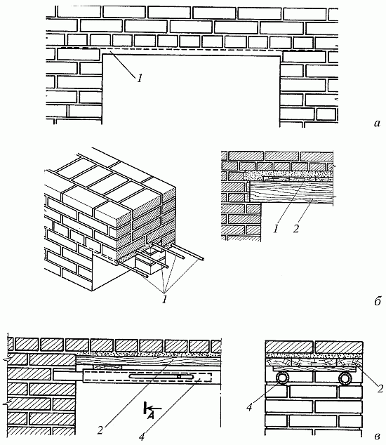 Рис. 25. Кладка рядовых перемычек: а – фасад; б – разрез; в – кладка по дощатой опалубке; г – кладка на инвентарных кружалах; 1 – арматурные стержни; 2 – доски; 3 – деревянные кружала; 4 – трубчатые кружала