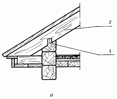 Рис. 29. Опирание наслонных стропил: а – в деревянных, рубленых или брусчатых постройках: 1 – шип; 2 – стропильная нога