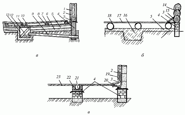 Рис. 45. Конструкции полов: а – бетонный пол; б – деревянный протекающий пол; в – деревянный непротекающий пол. 1 – внутренняя обшивка каркасной стены; 2 – пароизоляция стены; 3 – гидроизоляция; 4 – фундамент; 5 – щебеночно-гравийная подсыпка; 6 – бетон с теплоизолирующим наполнителем; 7 – выравнивающая цементная стяжка; 8 – покрытие из керамических плиток; 9 – водосливная труба; 10 – деревянная решетка; 11 – водосточная решетка; 12 – щит гидрозатвора; 13 – приямок; 14 – бревенчатая стена; 15 – плинтусная доска; 16 – поглощающая яма; 17 – пол протекающий; 18 – асбестоцементные трубы; 19 – внутренняя обшивка стены из арболита (или кирпича); 20 – лаги; 21 – лоток; 22 – лаги, образующие желоб; 23 – пол непротекающий