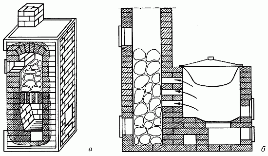 Рис. 65. Кирпичные печи-каменки периодического действия: а – без водогрейной емкости; б – с водогрейным котлом