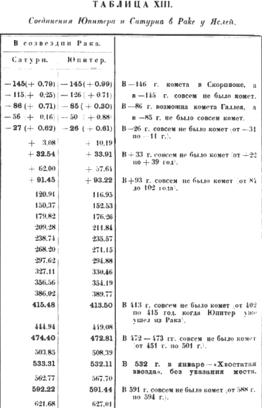 В. — Во вторую серию схождений Юпитера и Сатурна в Раке кометы были только в январе 532 года в Змиедержце, когда Юпитер был уже впереди Сатурна, да еще как раз при уже отмеченном нами схождении Юпитера и Сатурна в 710 году, с поразительной точностью осуществляющем библейское описание.