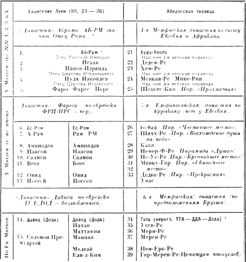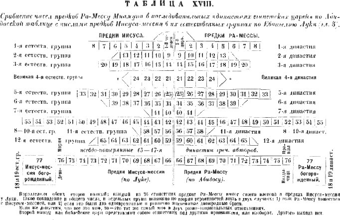 Взгляните далее на таблицу XIX. Посредине ее дана (числами 1, 2, 3 и т. д.) последовательность имен 76 предков Иисуса, перечисленных в Евангелии Луки (левая сторона таблицы) и параллельно ей (на правой стороне) приведена последовательность 76 предков Ра-Мессу Великого на Абидосской стенной таблице, кончающейся «Владычицей правды», матерью Ра-Мессу (см. табл. XXVIII в конце книги). Неодинаковый звуковой состав имен в Евангелии Луки и в иероглифах Абидоса не должен нас смущать. Эти имена даже и в египтологии называются «коронационными», т.е. носимыми со времени коронации в Египте, и все они представляют лишь местные прозвища или титулы. А в евангельской параллели даны арабско-еврейские прозвища тех же лиц, имеющие смысл лишь на еврейском языке.