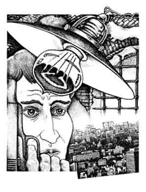 ….Метров через двести мужчина оглянулся и нырнул в подворотню. Там он одним ударом распахнул небольшую полуподвальную дверь, и пудовый висячий замок волчком закрутился на бетонных ступенях. За дверью была винтовая лестница. Беглец еще раз оглянулся и бросился вверх по спирали. Добежав по четвертого этажа, он, опять же рукой, вышиб вместе с коробкой обитую жестью дверь и очутился на чердаке соседнего здания….У Мишутина начало закрадываться подозрение, что беглец давно знает эти переходы и заранее продумал все пути отступления, уж очень хорошо он ориентировался в темноте среди огромных балок и каменных дымоходов. Проскочив чердак, они очутились на какой-то черной лестнице. Один пролет сменялся другим. Полковнику начало казаться, что, кроме этой лестницы, вне времени и пространства, больше ничего не существует, да и никогда не существовало, а они спускались все ниже и ниже, тяжело стуча ботинками по чугунным ступеням. И вот, когда Мишутин уже хотел остановиться и прекратить этот бессмысленный бег к центру Земли, снизу послышались хлюпающие звуки. Его противник, наконец, достиг конца лестницы.