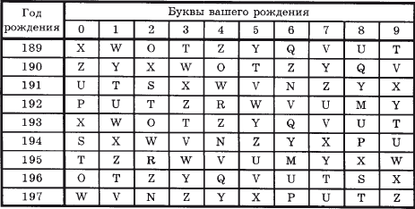 Человек родился 9.05.1945 года, читая вниз по первой колонке (Таблица 1) найдите 194, затем по горизонтали – «5». Буква вашего рождения – «z». Внесите её в колонку № 1 таблицы 9.