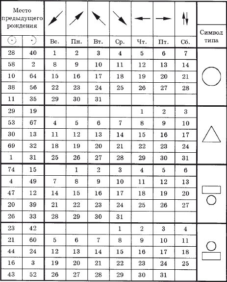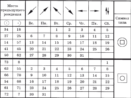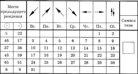 Е сли вы были в предыдущей жизни мужчиной (женщиной) найдите знак символа – ваш тип и напротив него день вашего рождения. Слева под знаком (муж.) или (жен.) найдите номер вашего мес а рождения. Внесите его в таблицу № 9 в колонку 6. На вершине таблицы № 3 под днём рождения найдите символ предназначения вашей жизни. Внесите его в колонку 7 таблицы № 9. Имея сведения в таблице № 9 вы можете прочесть всё о себе в таблицах 4–8.