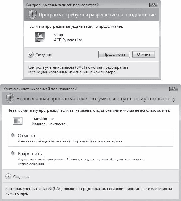 Рис. 7.10. Вид окон UAC при запуске приложений с цифровой подписью и без нее